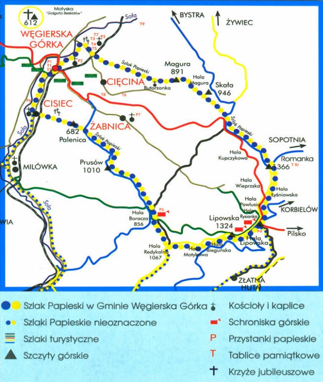 Szlak zaczyna się przy stacji kolejowej, następnie biegnie w kierunku miejscowości Rajcza i w górę Milowskiego Potoku. Hala Boracza nie jest porośnięta lasem, co pozwala podziwiać z jej okolic panoramę gór. W pobliżu Hali znajduje się jedna z najbardziej znanych jaskiń w Beskidach, Jaskinia Boracza. Hala Lipowska była w przeszłości wykorzystywana do wypasu owiec – pamiątką po tych czasach jest drewniany krzyż, pod którym odprawiano msze święte dla pasterzy. Inna nazwa szlaku to Szlak Papieski, upamiętniająca wielokrotne wizyty biskupa i kardynała Karola Wojtyły w Milówce oraz na Hali Lipowskiej.